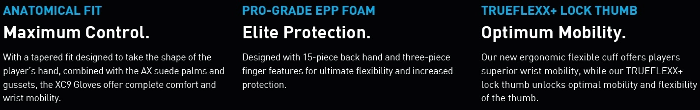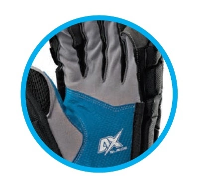 EXTERIOR SHELL FEATURING PREMIUM NYLON AND TEXTURED PU. AX SUEDE BASE PALM SEWN IN WITH TRUE BLUE AX SUEDE OVERLAY. PRO GRADE 24MM EPP FOAM WITH PE INSERTS.