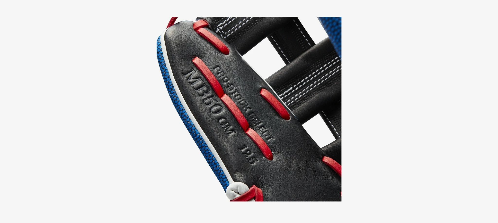 Ready to rob homers and steal the spotlight, the 2022 A2K® MB50 GM was meticulously designed for Los Angeles outfielder Mookie Betts. This 12.5” model with a narrower heel offers more control, and the Black Pro Stock® Select leather and sturdy Dual Post Web can haul in any fly ball. White and Royal Blue SuperSkin™ reduces glove weight while improving durability.