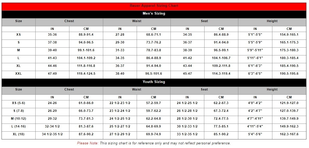 - BAUER screen printed logo on left sleeve, right chest, and back neck