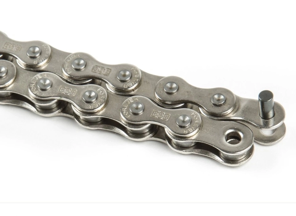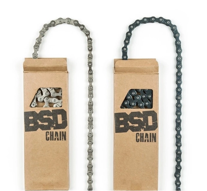 A super tough chain with pre-installed half link, rustproof and teflon coating, stamped BSD logos and mushroomed pins. Compatible with 8t drivers.