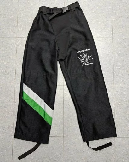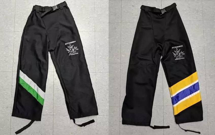 Made from a heavy-duty polyester material, the pants are strong, come belted and are double layered from the knee down.