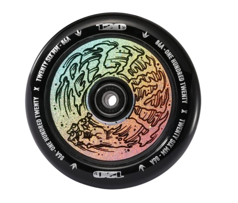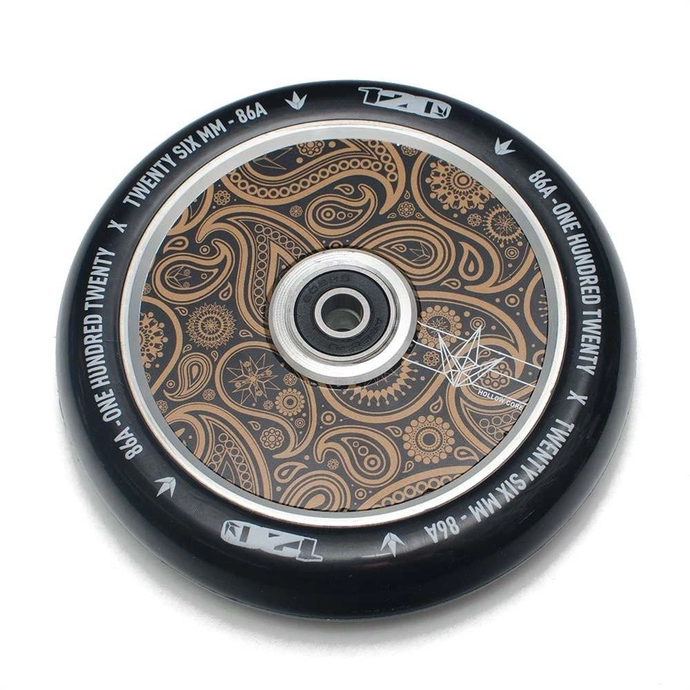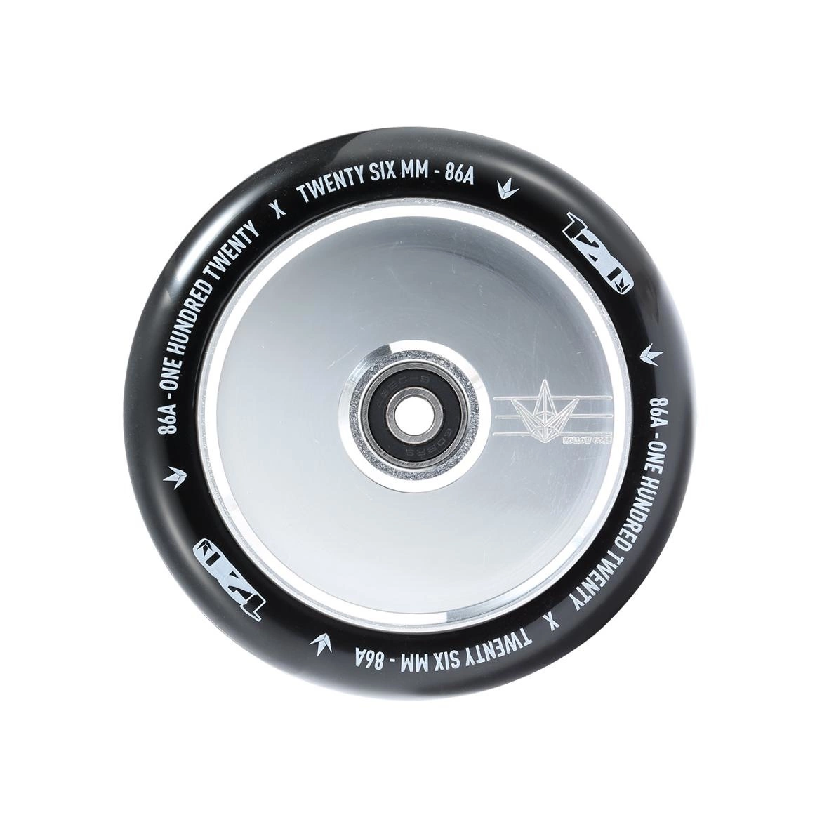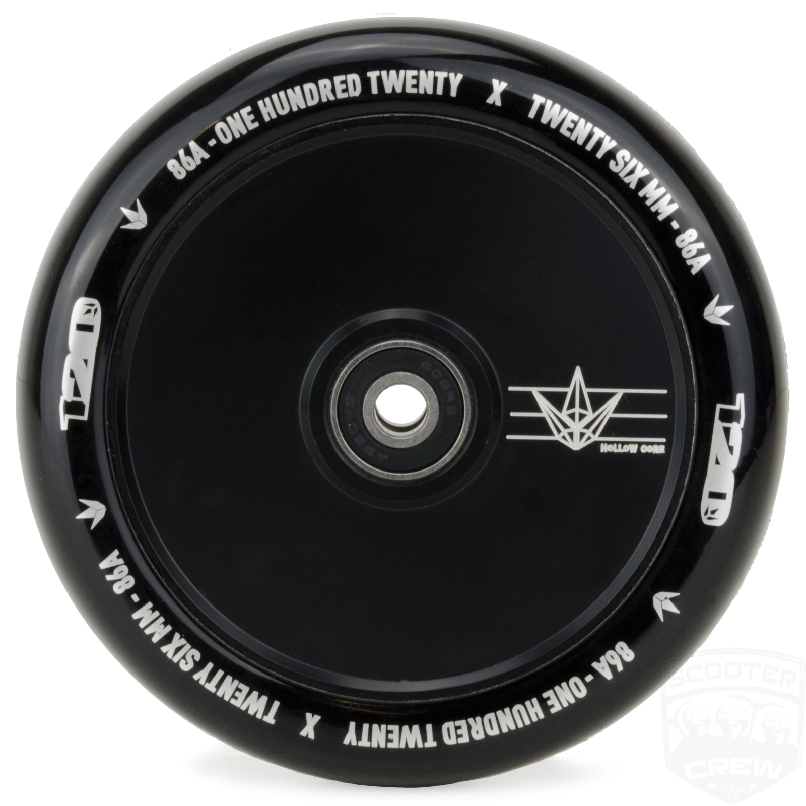 The Envy Hollow Core 120mm pro scooter wheel comes with a 26mm wide urethane that provides more grip in corners. 86A durometer urethane provides a softer feel and extra grip so it keeps you from sliding around at the skatepark. The wider urethane on this wheel makes it a little difficult to install on your fork; please be careful with installation. These Envy Hollow Core 120mm scooter wheels are sold individually and INCLUDE bearings equivalent to ABEC 9’s. Keep in mind that these wheels are bigger than your average wheel so they might not fit on all scooters.