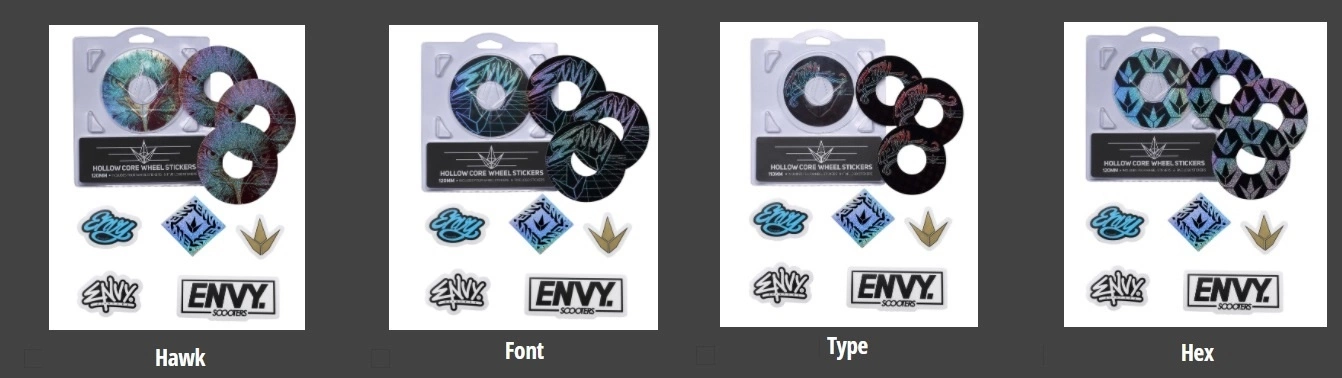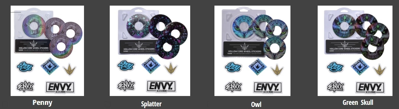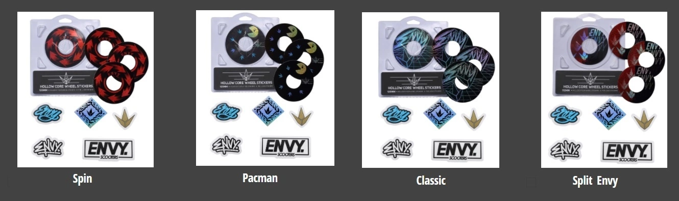 Envy wanted to create a way for you guys to customize your scooter and make it different from all your friends. Say hello to the Envy Wheel sticker packs. For a low price you get a pack of 4 stickers that cover and replace the design and color of your current hollow core scooter wheels. With lots of different designs, you’ll stand out from everyone at your local skatepark.