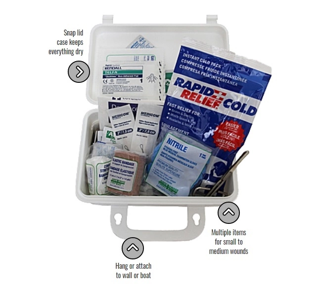 Great all-purpose first aid kit is handy for any size boat, car, classroom or at home