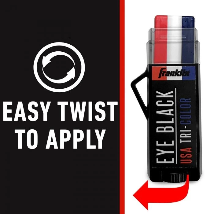 Franklin Sports NEW MLB Premium Colored Eye Black sticks combine performance, quality, and style. Enhance your visibility under sun or stadium lights with an eye black color that matches your team uniform! Engineered to offer a superior sweat-resistant formulation that will keep you dry and confident. Available in a variety of colors: Pure Black, Steel Blue, Ember Red, and our unique USA Tri-Color stick featured on-field!
