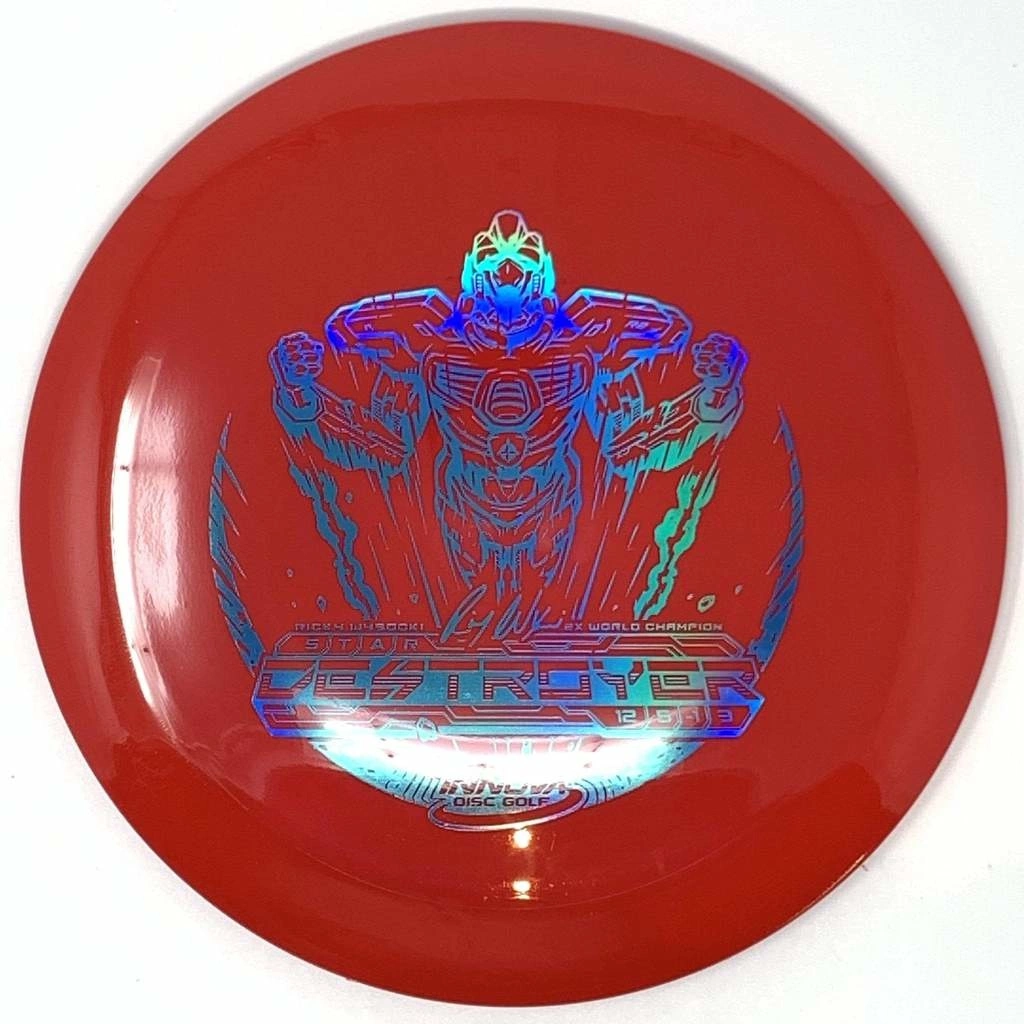 Speed 12, Glide 5, Turn -1, Fade 3 | The Destroyer is a very fast stable long distance driver. This disc is much like a faster Wraith, but with a little more high and low speed stability. Great disc for sidearm throwers and those with lots of power. Can handle headwinds and throws with off axis torque.