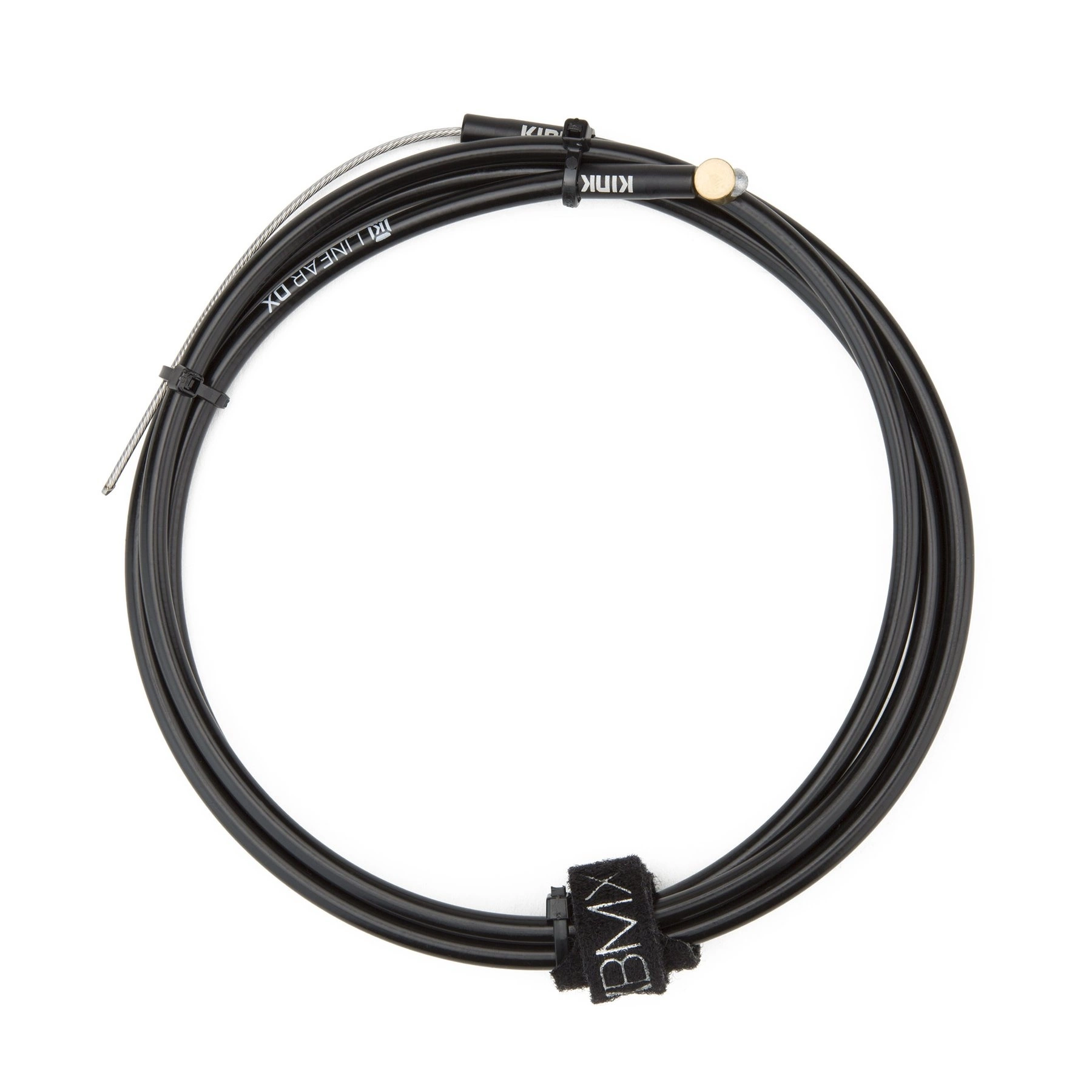 The Kink Linear DX cable features an outer linear strand housing, which decreases bind when the cable twists during tricks. The custom brass lever lug allows the inner wire to twist freely within the brake lever eliminating twist and bind even further. The inner 1.5mm cable is ground smooth to create an even smoother, drag free pull. Aluminum ferrules prevent housing failure at both ends, and can easily be refitted after cable trimming.