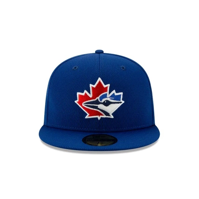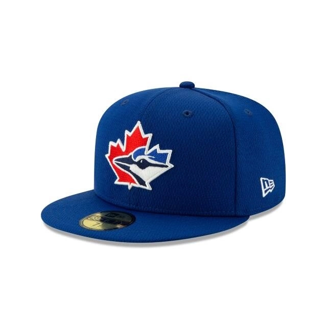 The Toronto Blue Jays Batting Practice 59FIFTY Fitted Cap features an embroidered Blue Jays logo at the front panels filled with an alternate logo that is also found at the right-wear side. Additional details include a team color MLB Batterman logo at the rear.