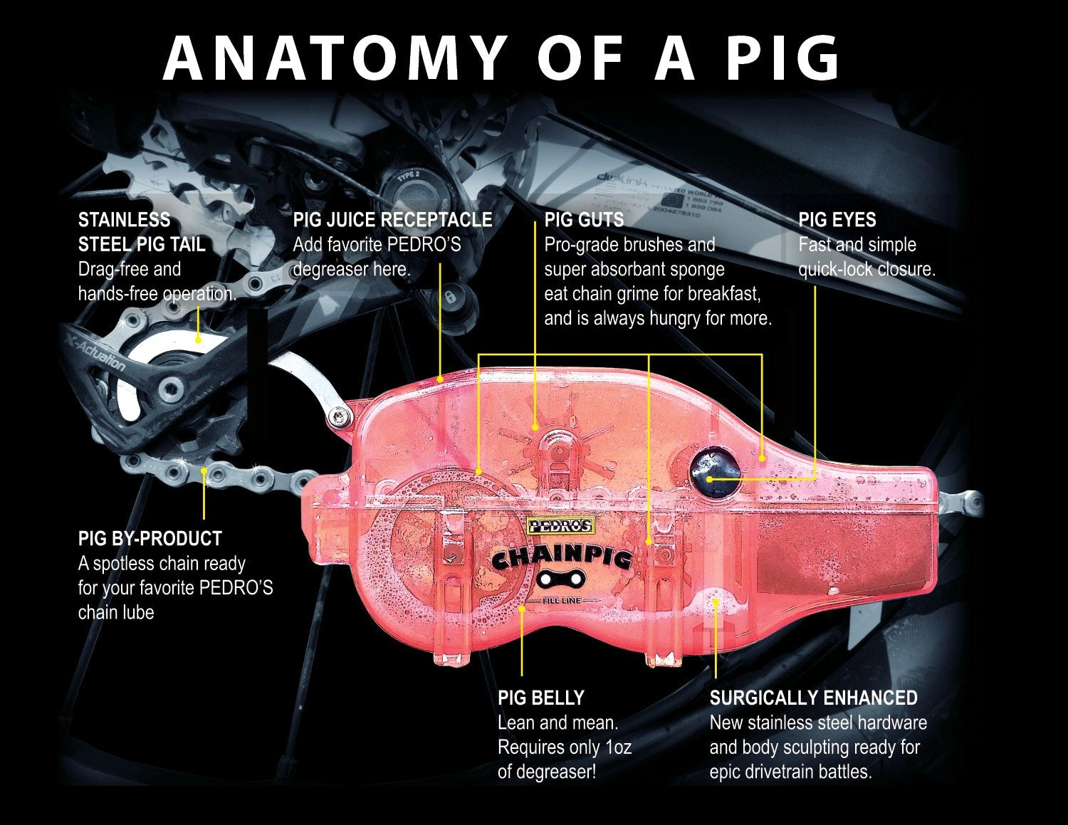 The Chain Pig II hands-free chain cleaner will change the way you think about cleaning your chain. Just one use with our latest solvent-free degreasers and you too will become a believer just as so many riders and skeptical pro mechanics have.