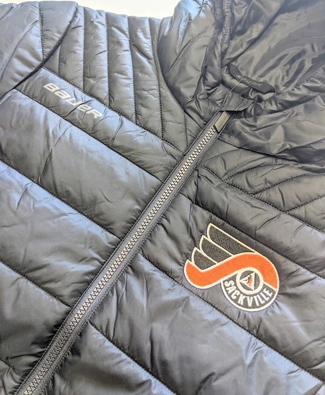 Sackville Flyers Logo in fill color, embroidered on left chest.