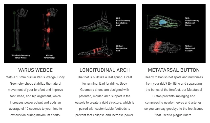 - Body Geometry sole construction and footbeds are ergonomically designed and scientifically tested to boost power, increase efficiency, and reduce chance of injury by optimizing hip, knee, and foot alignment.