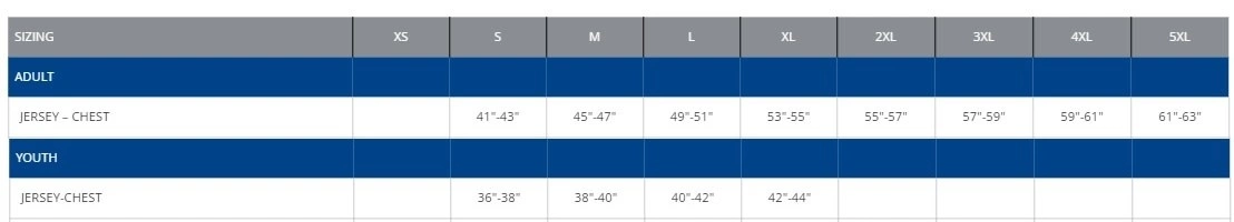 | Size | YTH SM, YTH MED, YTH LRG, YTH XL, YTH XXL, YTH GOALIE, AD SM, AD MED, AD LRG, AD XL, AD XXL, AD GOALIE, AD 4XL |