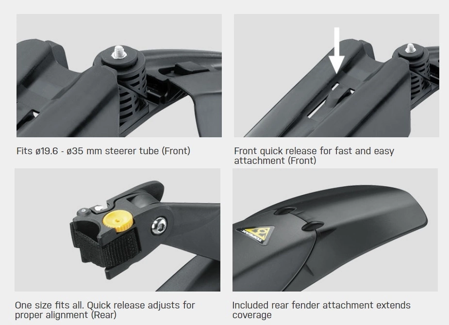 Specifically designed for 27.5” and 29” wheeled MTB’s. The DeFender™ front and rear fenders are the perfect choice for lightweight durable mud protection on those wet and sloppy rides. Quick release allows DeFenders to be installed and removed in seconds. A highly polished underside helps prevent dirt buildup and aids in cleaning. Fits 27.5” – 29” MTB tires up to 3” wide.