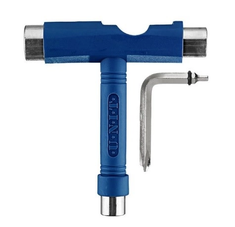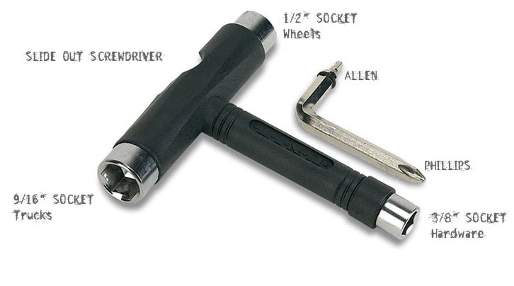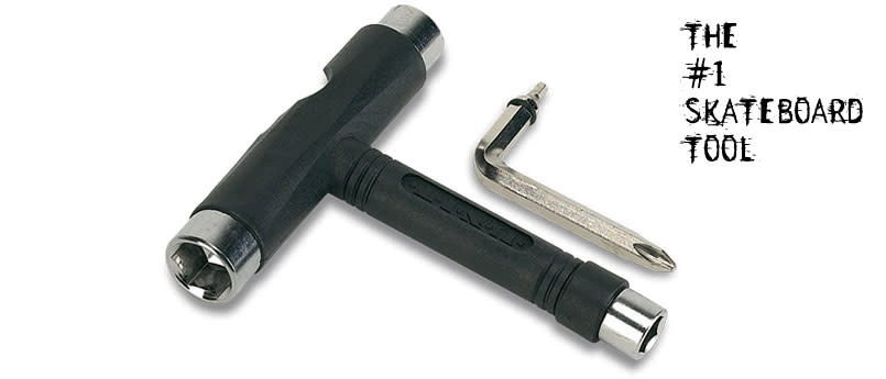 A multi-function 5-in-1 skateboard tool with everything you need to assemble your complete and keep your board finely tuned.